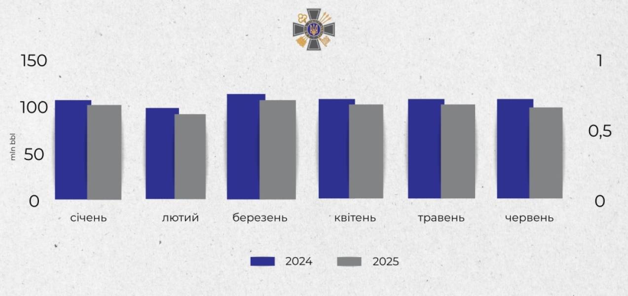 «Порівняння обсягів постачань Росією нафти за перше півріччя 2024 та 2025 років свідчить, що експорт РФ неухильно зменшується», – констатують у розвідці.