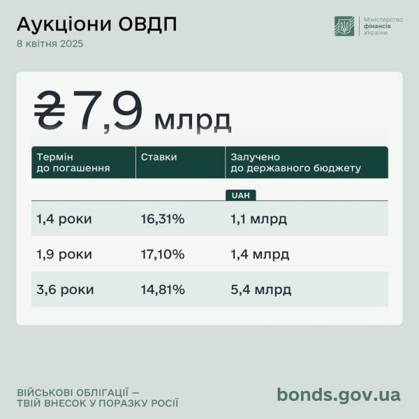 Мінфін розмістив ОВДП на ₴7,9 мільярда 08.04.2025 18:46 Укрінформ Міністерство фінансів України 8 квітня 2025 року на аукціоні з розміщення облігацій внутрішньої державної позики (ОВДП) залучило до державного бюджету 7,9 млрд грн.
