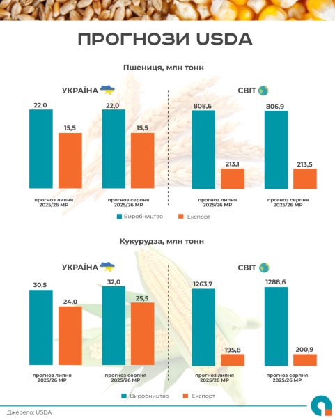 USDA прогнозує збільшення виробництва та експорту української кукурудзи Інфографіка 17.08.2025 09:36 Укрінформ Міністерство сільського господарства США (USDA) оновило прогноз балансу основних сільськогосподарських культур на 2025/2026 маркетинговий рік, де показники виробництва та експорту української кукурудзи збільшуються, а по пшениці залишаються сталими.